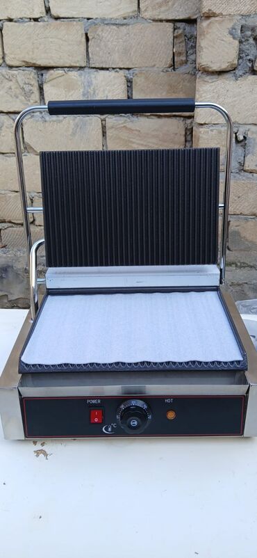 - Elektrik kontakt qril: üst-altarızlı qabarmalı/hamar plitələr, temperatur tənzimləyici (0–300°C göstəricili düymə), “Power” açarı və “Hot” indikatoru, istilikkeçirməyən tutacaq.