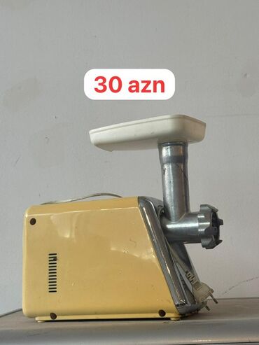 - Ətçəkən (elektrik): Kompakt korpus, metal ət kanalı və çıxış hissəsi, 220V şnur, üstdən yemdolduurma lövhəsi. Üzərində qiymət qeyd edilib: 30 AZN.