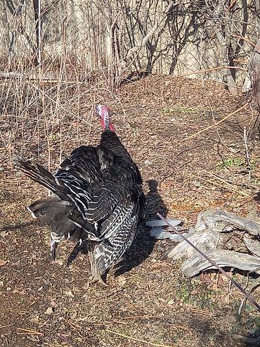 - Böyük cüssəli, qara və ağ naxışlı lələklər, uzun quyruq və qırmızı dimdikaltı ətliyi ilə diqqət çəkən erkək hind quşu.