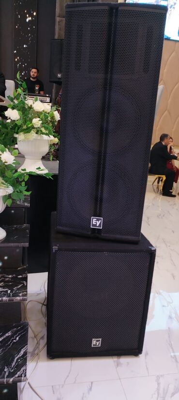 - 1 ədəd EV iki yollu top kabinet (ön paneldə iki böyük woofer görünür, metal mesh qəfəs, mərkəzdə vertikal port, EV loqosu)