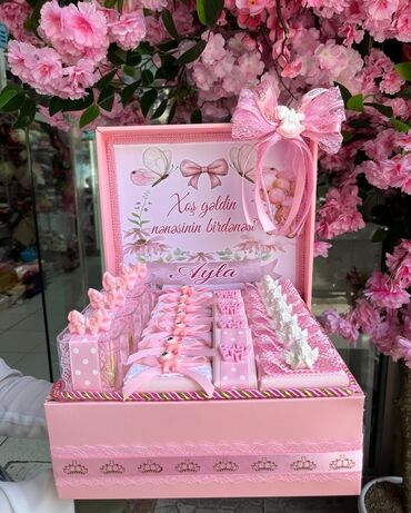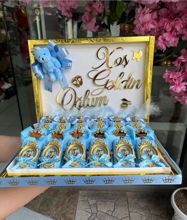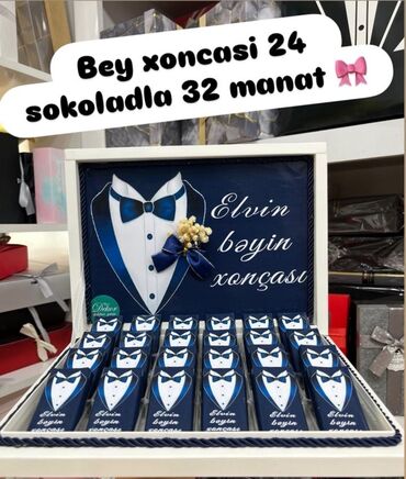 Məxməri bəzəkli, qapaqlı hədiyyə qutularında fərdiləşdirilmiş şokolad/konfet setləri. Toy, nişan, niyyət, “kiçik toy”, söz kəsmə, ad günü və digər tədbirlər üçün uyğun dizaynlar hazırlanır.