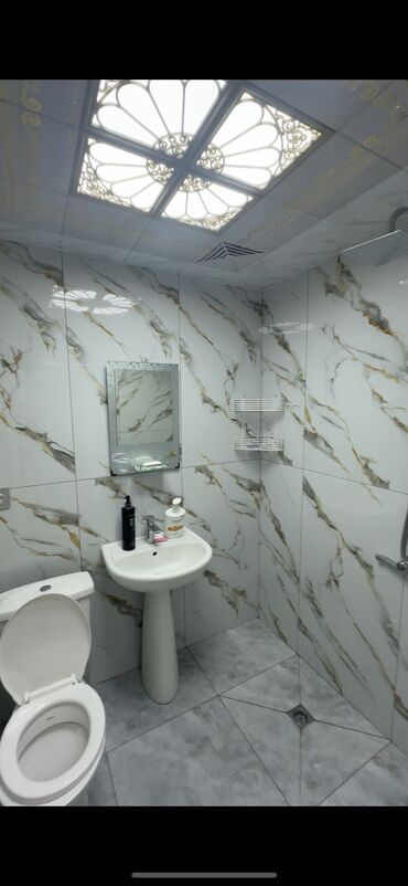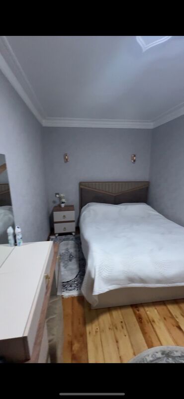 - Yataq otağı: iki nəfərlik çarpayı, tumbalar, güzgülü makiyaj masası, dekorativ divar işıqları, pastel boz divar kağızı, taxta döşəmə.