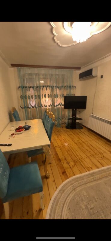 - Qonaq otağı: pərdələrlə örtülü iri pəncərə, divar tipli kondisioner, radiatorla mərkəzi isitmə, televizor üçün stand, zövqlü yemək masası və stullar, taxta döşəmə, tavan rozetkası və çilçıraq.