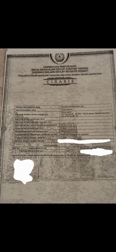 Gəncə şəhəri, Yeni Qaydalar (Məhsəti qəsəbəsi), Xan Çinar küçəsi, 28 ünvanında torpaq sahəsi.