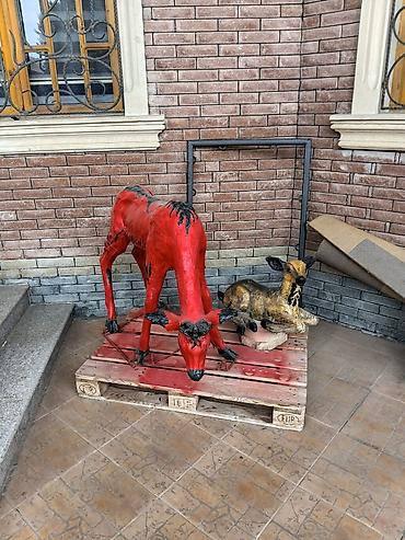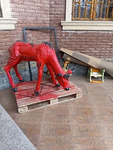 Qırmızı geyik heykəli – açıq məkan dekoru - Material: kompozit/şüşəplastik əsaslı heykəl (rənglənmiş), metal dayaqlar ilə paletə bərkidilib - Rəng: parlaq qırmızı, tünd detallarla vurğulanmış - Tə...