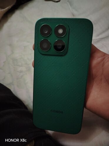 HONOR smartfon – yaşıl rəng Xüsusiyyətlər: - Ön tərəfdə mərkəzləşmiş “punch‑hole” kamera ilə tam ekran. - Arxa tərəfdə böyük kvadrat kamera bloku: iki əsas obyektiv və LED işıq. - Arxa qapaq dərim...