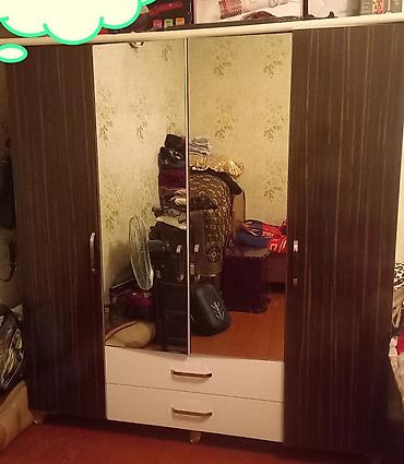 - Geniş qarderob şkafı – 4 qapılı, orta hissə güzgülü 2 qapıdan ibarətdir, aşağıda 2 çekmece. Kənarlar tünd ağac fakturalı, orta hissə açıq rəngli.