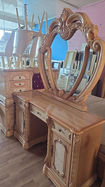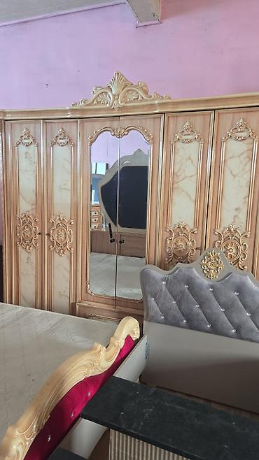 Yataq otağı dəsti – klassik krem-qızılı dizayn Komplekt: - 2 qapılı güzgülü qarderob (dolab ölçüsü: 200×160×47 sm; asılqan, rəf və bölmələr) - 2 ədəd tumbə - 3 çekmecəli komod - Başlıqla birlikdə ...
