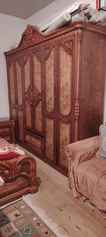 Klassik üslubda mebel dəsti - Yataq otağı üçün: iri başlıqlı, kapitone işləməli çarpayı; iki ədəd tumba; 6 qapılı iri qarderob (mərkəzdə güzgülü bölmə, yuxarıda dekorativ işləmələr); güzgülü tuale...