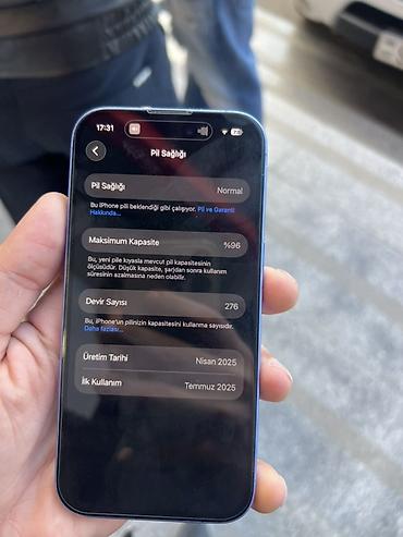 Məhsul: Apple iPhone (mavi rəng) Xüsusiyyətlər: - Arxa rəng: Dərin mavi, şüşə arxa panel və alüminium düz kənarlar - Ekran: Tam ön şüşə, kənardan-kənara geniş ekran - Kamera sistemi: - Arxa: İk...