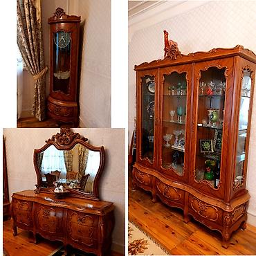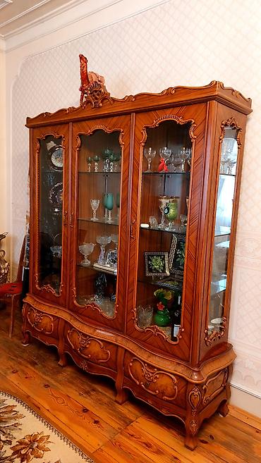 Dest satilir – klassik üslubda, təmiz ağacdan hazırlanmış qonaq otağı mebel dəsti. Tərkibi: - Böyük vitrin şkafı: 4 qapılı, şüşə vitrinlər, güzgülü arxa panel, aşağı hissədə çekmece və dolab bölmə...