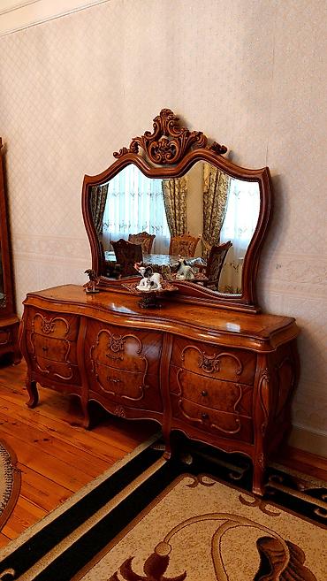 Klassik üslubda tam dəst mebel - Material: təbii ağac teksturasına malik massiv/şpon görünüşlü korpus, oyma dekor elementləri, frezerli haşiyələr, bürünc tonlu fitinqlər - Rəng: isti qəhvəyi, naxı...