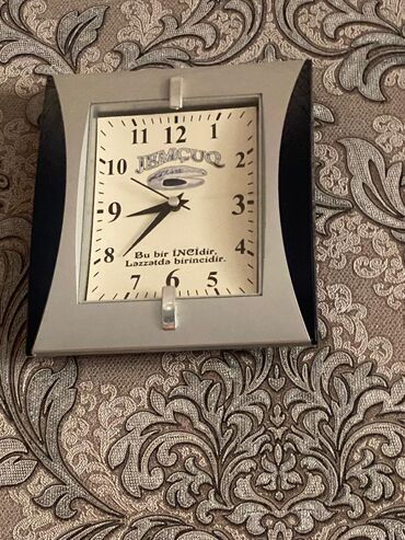 Saniyə əqrəbiGümüşü rəngli çərçivəyə malik, kvadrat formalı divar saatı. Saatın üzərində "Jemcuq" loqosu və bir ifadə yazılıb. Klassik dizaynı ilə ev və ya ofis interyerinə uyğunlaşa bilər. Təcili satılır! Buyurub maraqlana bilərsiz !