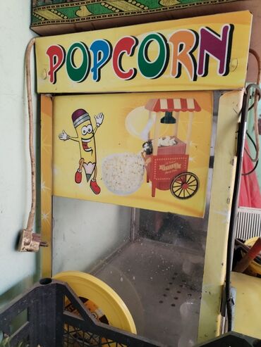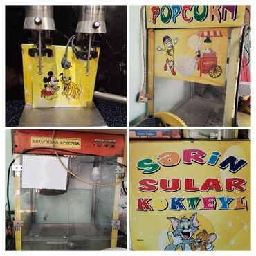 - Popkorn aparatı (sarı panel, “POPCORN” yazılı): şəffaf vitrin, daxili isitmə/işıq bölməsi üçün yerlər.