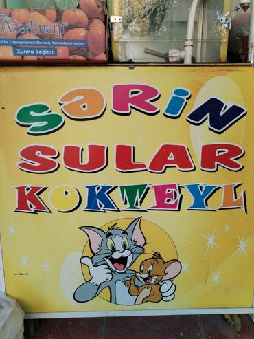 - “Sərin Sular Kokteyl” stendi üçün parlaq reklam paneli: diqqətçəkən yazılar və rəngli qrafika ilə.