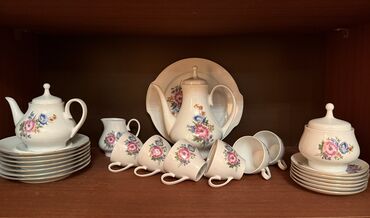 Tünd göy rəngli, ağ güllərlə bəzədilmiş çay dəsti. Dəstdə çaydan, şəkər qabı, süd qabı və 6 nəfərlik fincan və nəlbəki dəsti var. Qızılı haşiyələri dəstə xüsusi gözəllik verir.orjinal 1960 çı ildən...