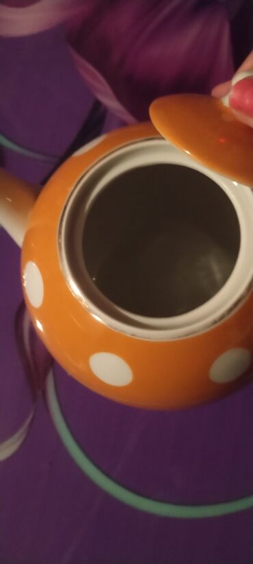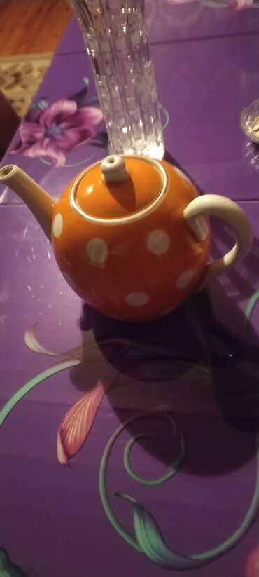 - Parlaq narıncı rəngdə, ağ xallı dekorlu klassik formalı keramika çaydan.