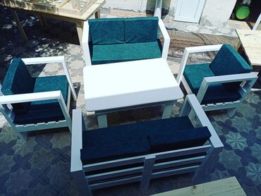 Açıq məkan üçün mebel dəsti - Tərkib: 1 ədəd uzun düzbucaqlı stol və 2 ədəd iki nəfərlik oturacaq (ümumilikdə 4 yer), dekorativ yastıqlarla. - Stol: Təbii taxta teksturalı üstlük, metal X formalı ...