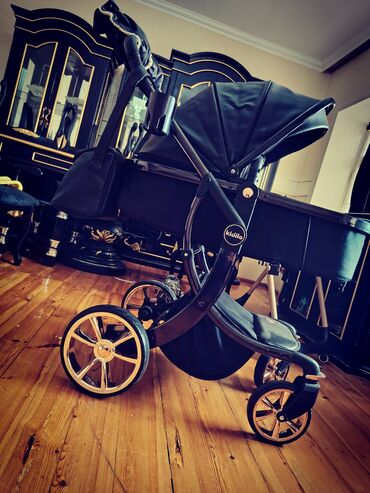 Uşaq arabası – premium sinif, qızılı rəngli alüminium şassi və qara toxuma komplekti. Xüsusiyyətlər: - 2-si 1-də sistem: bərk əsaslı beşik (carrycot) və oturacaq modulu üçün uyğun şassi. - Tənziml...