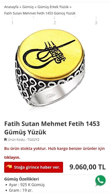 Məhsul: 925 ayar gümüş kişi üzüyü – “Fatih Sultan Mehmet Fətih 1453” mövzulu - Material: 925 ayar gümüş (daxilində “925” damğası və “Fetih 1453” yazısı var) - Üz hissə: Qızılı tonlu dairəvi səth, ...Giriş•Qeydiyyat