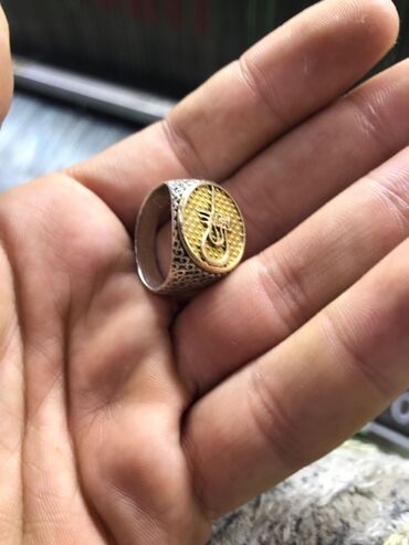 Gümüş kişi üzüyü - Material: gümüş rəngli metal ərintisi (üzərində dekorativ naxışlar). - Dizayn: klassik möhür üzüyü forması; yan hissələrində relyef ornamentlər və simvolik təsvirlər. - Mərkəz d...