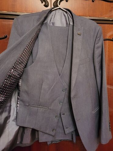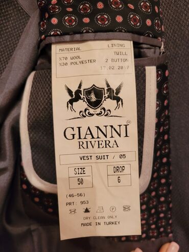 Gianni Rivera firmasının boz rəngli kostyumu. Kostyumun materialı 70% yun və 30% poliesterdir. Kostyumun iç hissəsi tvil parçadan hazırlanmışdır..Kostyum Türkiyədə istehsal olunub və ölçüsü 50-dir..