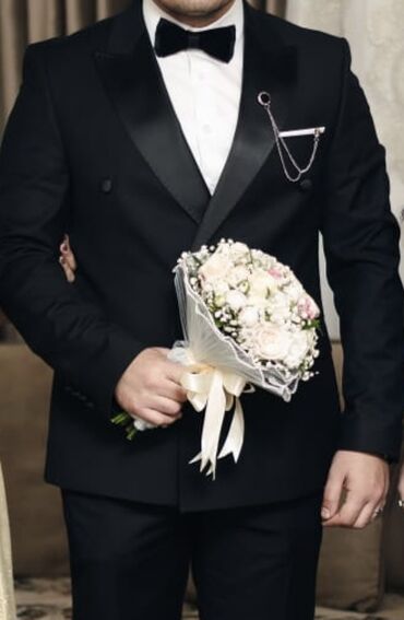 Klassik kişi smokinq dəsti (Koynek,babıcka.zapinka ile) Cinicidən alınıb 1 defe geyinilib - Rəng: qara - Komplekt: jaket, şalvar, ağ ziyafət köynəyi, qara kəpənək qalstuk - Kəsim: klassik, yüngül d...