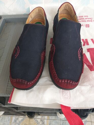 Kişilər üçün dəri mokasin/çukka tərzli ayaqqabı - Material: tünd göy rəngli yumşaq süet (zamşa) - Üst hissə: minimal tikişli, yumru-kvadrat burun; bağcıqlı variant və slip-on variant - Daxili: rah...