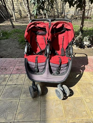İkiz uşaq arabası – yan‑yana iki oturacaq - Rəng: qırmızı/qaranlıq çalarlar, üst hissədə naxışlı, geniş günlük - Şassi: möhkəm qara metal konstruksiya, təkərlər cüt-cüt, fırlanan ön təkərlər - Otu...