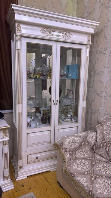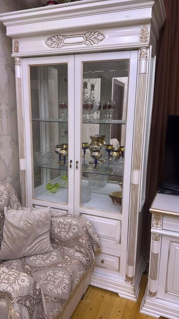 - 2 ədəd şüşəli vitrin: hər biri iki şüşə qapılı, içəridə 3 səviyyəli şüşə rəf; aşağı hissədə çekmece. Üst tağ və künclərdə klassik oyma elementlər və qızılı konturlar.