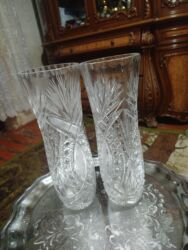Kristal şüşə vazalar dəsti - Material: qalın, şəffaf kristal şüşə - 2 ədəd vaza: 1) Geniş ağızlı, dalğalı kənarlı, dərin oyma naxışlı model. Klassik bitki və günəş şüası motivləri ilə dekor. Ort...