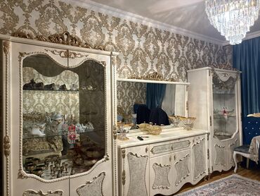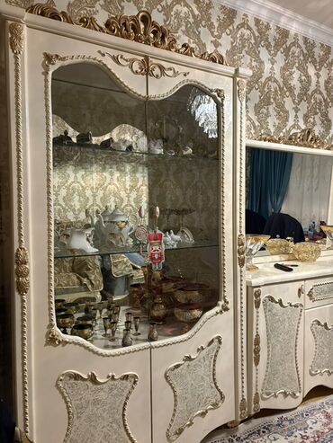 - 2 ədəd vitrin (şüşə qapılı, 3 rəfli, dekorativ frez və qızılı relyef ornamentlər)