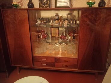 Mebel dəsti – vitrinli bufet/sərfəli saxlama şkafları. Qədim - Üslub: klassik/retro, taxta üzlüklü - Material: laklı ağac üzlük - Rəng: isti qəhvəyi/ceviz tonları, parlaq lak - İstifadə sahələri: q...