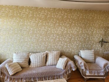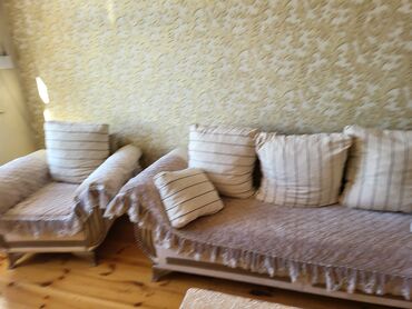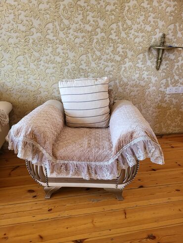 - Örtük: divan və kreslolar üçün eyni materialdan, krujeva haşiyəli, bej rəngli qoruyucu örtüklər