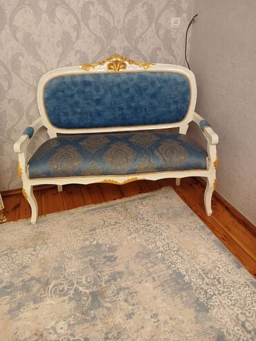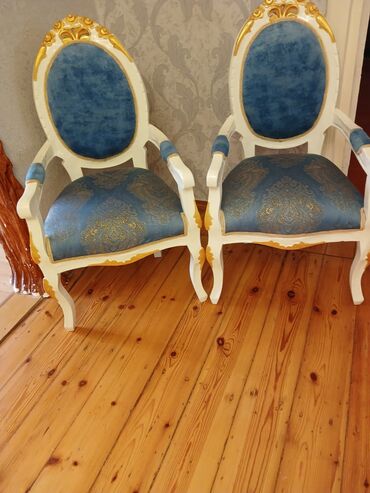 - Mavi rəng palitrası: arxalıqlar zərif məxmərə bənzər parça, oturacaqlarda qızılı naxışlı atlas tipli parça