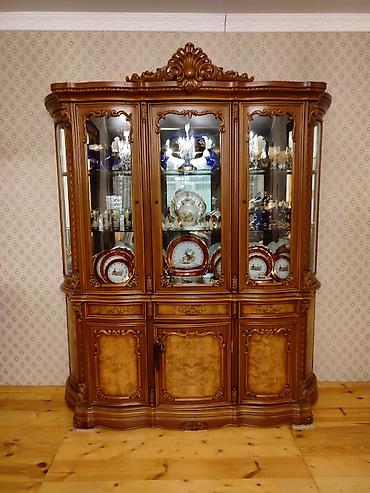 Klassik üslubda vitrinli bufet - Material: ağac karkas, təbii ağac teksturası və oyma dekor elementləri, qızılı tonlu bəzəklər - Üst hissə: üç bölməli şüşə vitrin; hər bölmədə şüşə rəflər və arxa ...