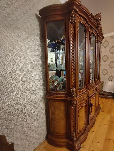 Klassik üslubda vitrin-bufet - Material: təbii ağac karkas, dekorativ oyma elementlər, cilalı örtük - Üslub: barokko/klassik, zəngin ornamentli fasadlar - Rəng: isti qoz tonları, kontrast naxışlı ...