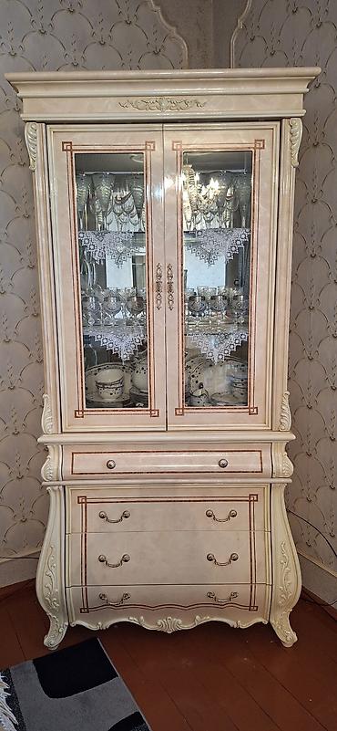 - Üst hissə: iki ədəd şüşə qapı, içəridə 3 səviyyəli rəf sistemi; qab-qacaq, biblio və kolleksiya əşyalarının sərgilənməsi üçün uyğundur