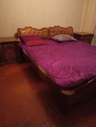 - İki nəfərlik taxta çarpayı: başlıq hissəsi yumşaq dəri/qaytan düyməli kapitone işləməli, dalğalı konturlu.