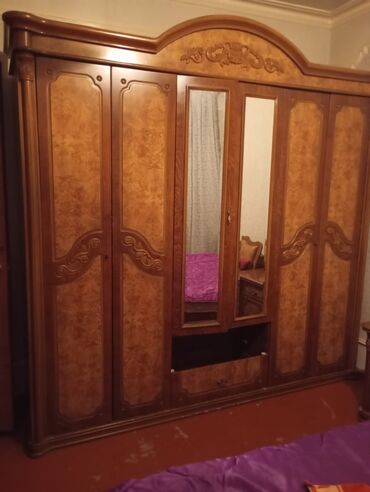 - Pərdəli böyük paltar şkafı: çoxqapılı (mərkəzdə güzgülü qapı), aşağı hissədə geniş çekmece, fasadda relyef oyma və qoz-kahı rəngli dekor panel.