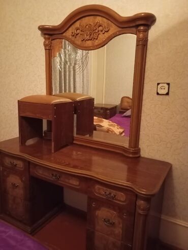 - Geniş tualet masası: iri güzgü ilə, yuxarı hissədə klassik ornament, iki tərəfdə çekmece blokları, dalğalı kənarlı taxta stolüstü.