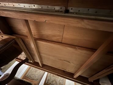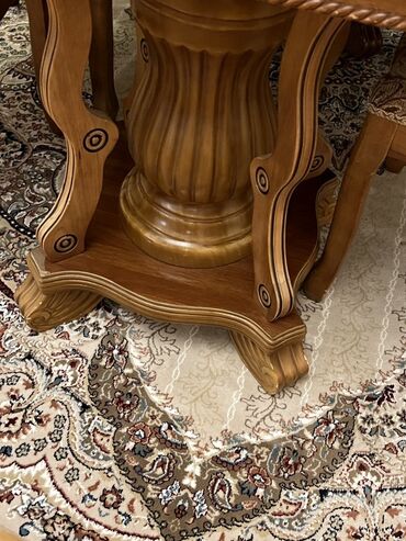 - Masa: qalın taxta üstlük, yumşaq radius künclər, oyma haşiyə; dekorativ formaya malik massiv mərkəzi ayaq və dayanıqlı baza