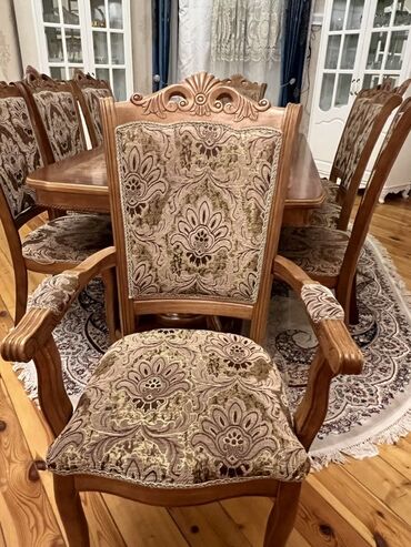 Zərif görünüş, detallı oyma işləmələr və komfortlu oturuşu ilə diqqət çəkən dolu bir yemək dəstidir. Geniş masa ailə yeməkləri və qonaqlamalar üçün əlverişlidir.