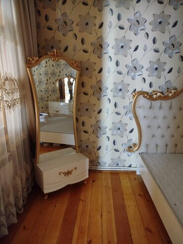 - Tualet masası/güzgü stendi: Yuxarıda qızılı çərçivəli dar güzgü, aşağıda 1 geniş çekmece, əyri xətli dekor.