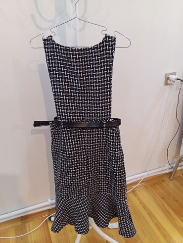 Klassik “herringbone/itburnu” (qazayağı) naxışlı qadın paltarı. - Model: qolsuz, V-yaxa, A-kəsim ətək hissəsi - Rəng: qara-ağ naxış - Ön hissə: iri dekorativ düymələr boyunca düymələnmə - Kəmər...