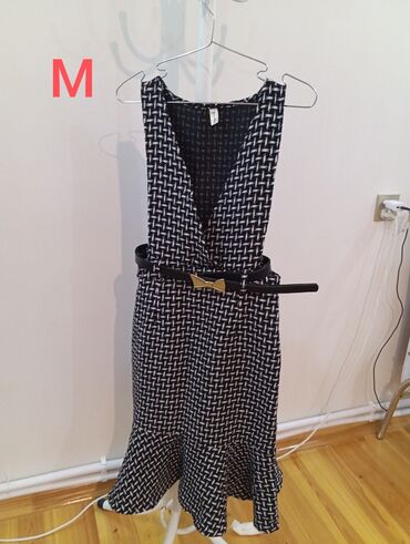 Qara klassik qadın donu L razmer - Rəng: tam qara - Kəsim: yüngül dar, dizə yaxın uzunluq - Yaxa: V formalı, xırda bəzək daşları/boncuklarla işlənmiş - Qol: qısa qol - Material: nazik, elastik tri...