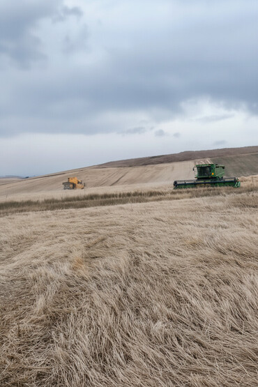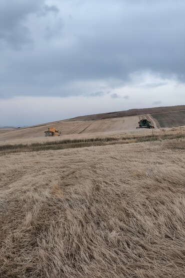 - Geniş açıq sahə, biçənək/əkin üçün yararlı relyef. Fotoşəkillərdə taxıl biçini gedən ərazi görünür – kombaynla işləməyə, texnikanın rahat hərəkətinə uyğun enli zolaqlar.