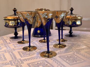 Mavi-kobalt şüşədən hazırlanmış bər-bəzəkli desert/şam şərabı dəsti. - Tərkib: 2 ədəd iri ayaqlı meyvə/desert qabı + 4 ədəd kiçik ayaqlı qədəh-kasa. - Material: qalın kobalt şüşə. - Bəzək: 24K ton...