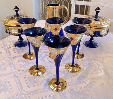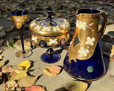 Məhsul: Boyalı bədii şüşə-serviz dəsti Tərkib: - Qızılı tonlarda sürahi və 6 ədəd qədəh (yaşıl içlikli) - Kobalt-mavi və qızılı rənglərin kombinasiyasında 4 ədəd ayaqlı desert/qədəh kasası - Kobal...