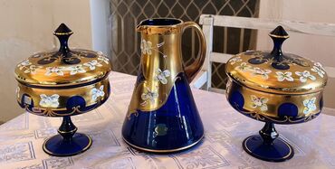 Kobalt mavi şüşədən 3 hissəli dəst – əl işləməsi bəzəkli qablar - 2 ədəd ayaqlı iri kasa və 1 ədəd alçaq şirniyyat/qoz-fındıq qabı - Dərin kobalt mavi şüşə, üst hissədə geniş qızılı kəmər - Qızılı...